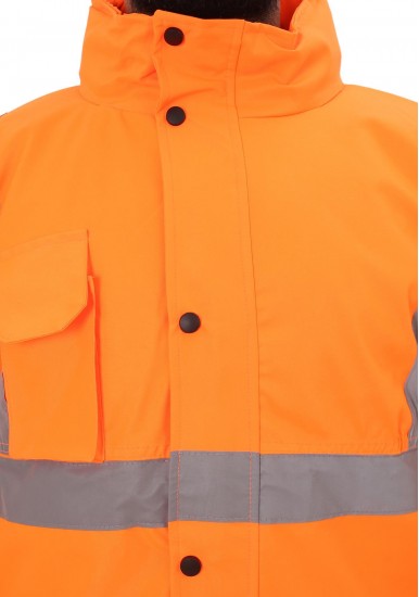 300D Oxford kumaş, EN20471 Standardına göre florosan sarı ve turuncu renklerde, reflektör ile yüksek görünürlüklü güvenlikli çalışma sağlar.